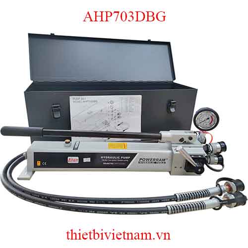 Bộ bơm thủy lực dung tích 2 lít AHP703DBG, áp suất 700 bar, 2 chiều. Bộ hoàn chỉnh bao gồm đồng hồ, co nối, ống dầu 1,5m. Vali đựng chuyên dụng bằng thép, tài liệu hướng dẫn sử dụng. Powerram Taiwan. Chuyên dụng cho các xylanh dầu 2 chiều đẩy – kéo có áp suất làm việc tới 10000psi.