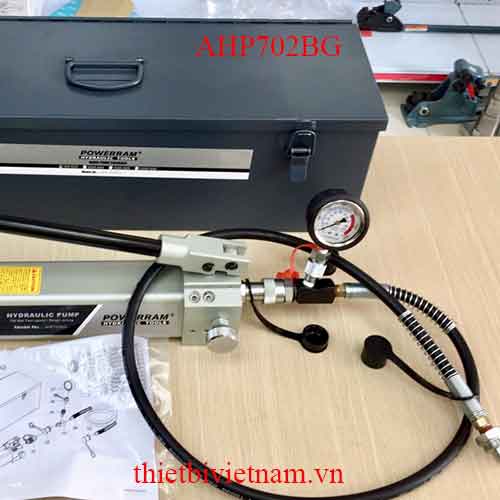 Bộ bơm thủy lực AHP702BG dung tích 1 lít, áp suất 700 bar, 1 chiều. Bộ hoàn chỉnh bao gồm đồng hồ, co nối, ống thủy lực 1,5m. Vali đựng chuyên dụng bằng thép, tài liệu hướng dẫn sử dụng. Powerram Taiwan. Bộ thích hợp cho những ứng dụng mới hoàn toàn, kết hợp với các phần tử thủy lực Single Acting hoạt động ở áp 10000psi.