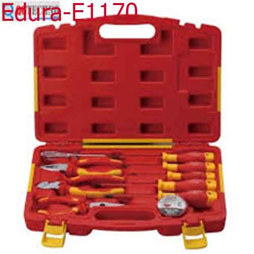 Bộ đồ nghề cách điện 1000v Dẹp (2.5x75), (4.0x100), (5.5x125mm) Pake (5x80mm), (6x100mm) Viết thử điện - băng keo, Kềm nhọn 8", Kềm răng 6", Kềm cắt 6", Edura E1170, với model E1170 là dòng sản phẩm chất lượng nhất mà hãng Edura nghiên cứu và phát triển ra .Với chất lượng tuyệt vời mà nó mang lại,sản phẩm này chắc chắn sẽ là người bạn đồng hành hoàn hảo dành cho bạn