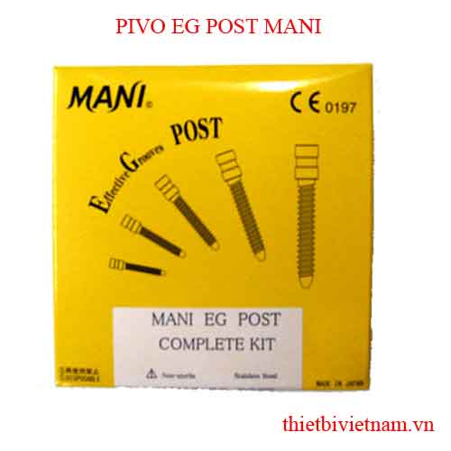 Loại thép không gỉ được chọn lựa kỹ càng và những rãnh cắt hiệu quả đem lại độ bền và khả năng chống ăn mòn cao. Sản phẩm có sẵn 21 kích thước khác nhau, đảm bảo bạn sẽ tìm được kích thước phù hợp với nhu cầu của mình. Vì sản phẩm được sản xuất theo tiêu chuẩn ISO, bạn không cần dùng thêm các loại mũi khoan khác. Đường kính của MANI EG Posts nhỏ hơn MANI Peeso Reamer 0.05mm, giúp giảm áp lực lên ống tuỷ.